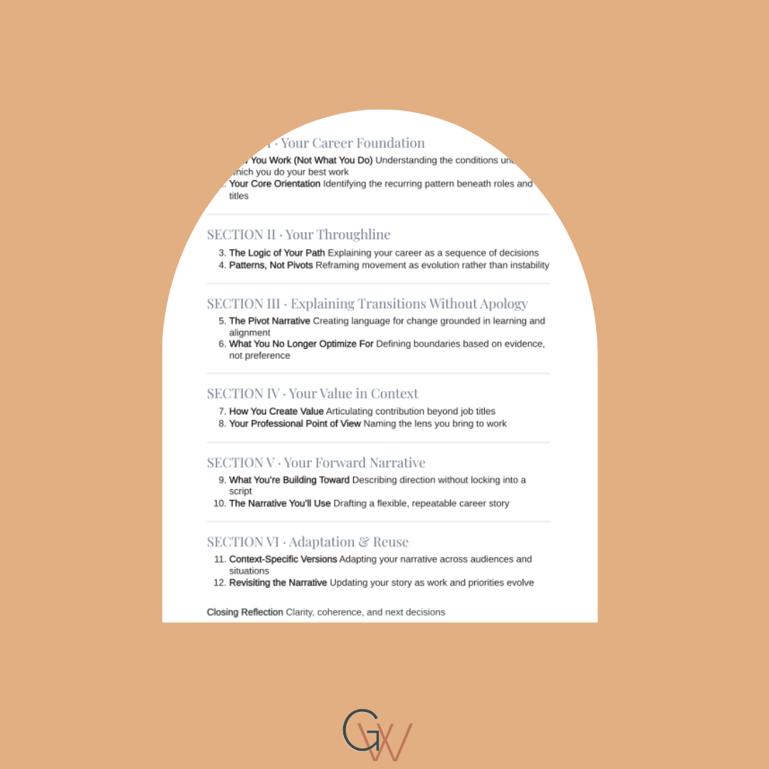 This shop includes digital frameworks, live workshops, and free resources designed to support thoughtful career design. Some offerings are self-guided, while others are facilitated live.